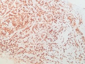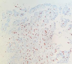 Por último, el Ki-67 es un marcador de proliferación celular. Un alto nivel de Ki-67 sugiere un crecimiento rápido del tumor, lo que podría requerir un tratamiento más agresivo.