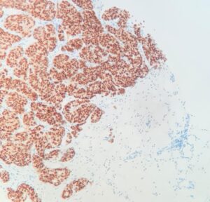 Receptor de Estrógenos positivo. Núcleos marcados con DAB (marrón).